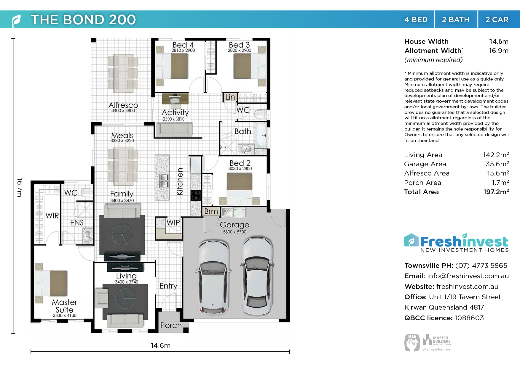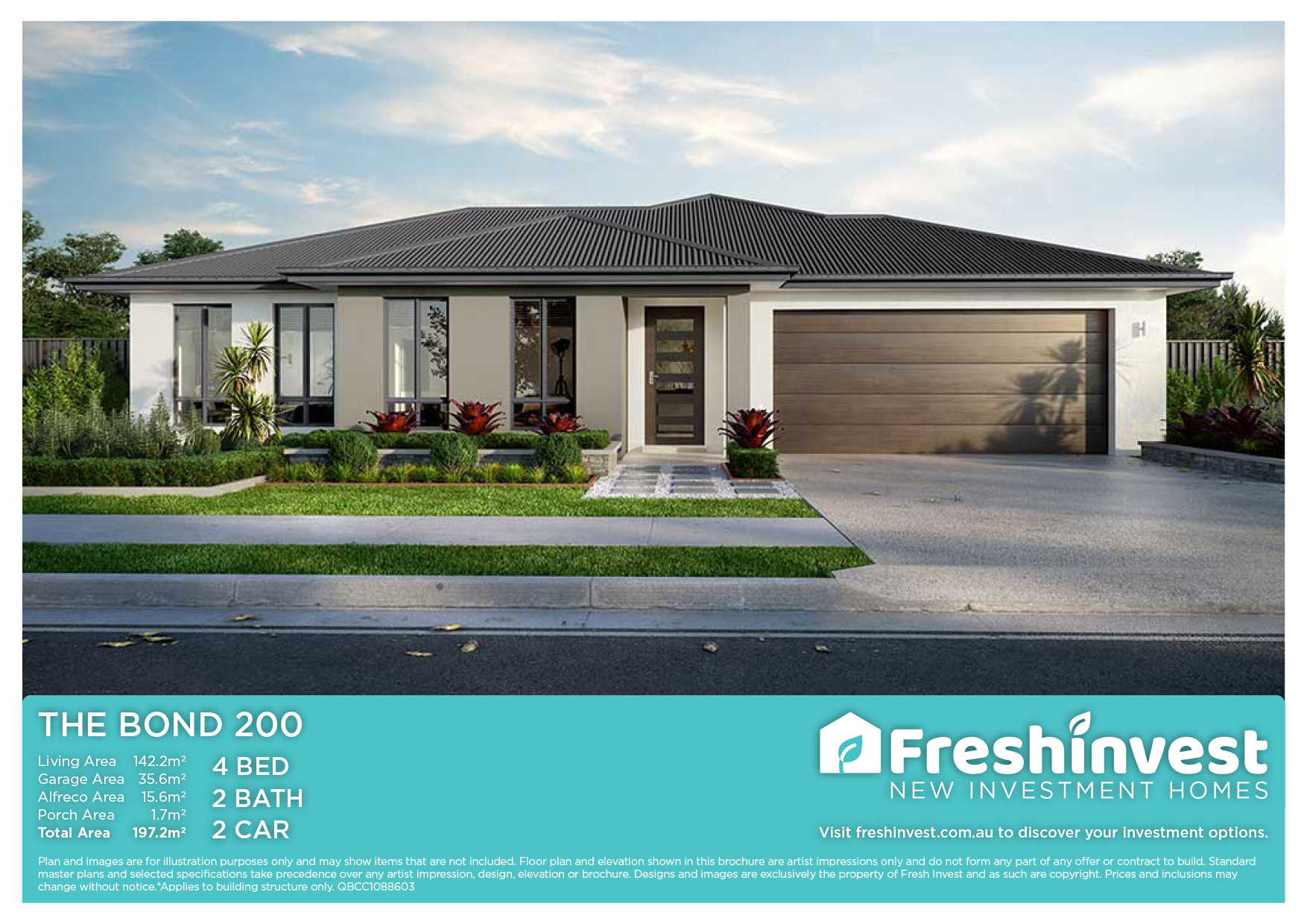 Plan and images are for illustration purposes only and may show items that are not included. Floor plan and elevation shown in this brochure are artist impressions only and do not form any part of any offer or contract to build. Standard master plans and selected specifications take precedence over any artist impression, design, elevation or brochure. Designs and images are exclusively the property of Fresh Invest and as such are copyright. Prices and inclusions may change without notice.*Applies to building structure only. QBCC1088603.