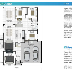 * Minimum allotment width is indicative only and provided for general use as a guide only. Minimum allotment width may require reduced setbacks and may be subject to the developments plan of development and/or relevant state government development codes and/or local government by-laws. The builder provides no guarantee that a selected design will fit on an allotment regardless of the minimum allotment width provided by the builder. It remains the sole responsibility for Owners to ensure that any selected design will fit on their land.