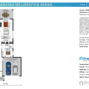* Minimum allotment width is indicative only and provided for general use as a guide only. Minimum allotment width may require reduced setbacks and may be subject to the developments plan of development and/or relevant state government development codes and/or local government by-laws. The builder provides no guarantee that a selected design will fit on an allotment regardless of the minimum allotment width provided by the builder. It remains the sole responsibility for Owners to ensure that any selected design will fit on their land.