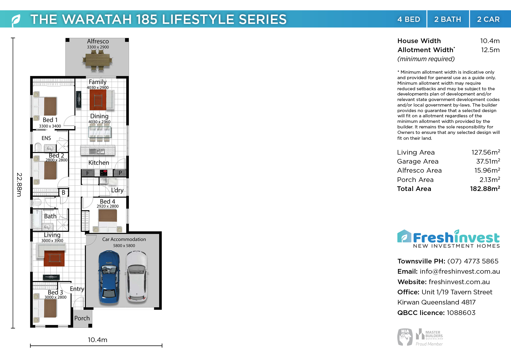Plan and images are for illustration purposes only and may show items that are not included. Floor plan and elevation shown in this brochure are artist impressions only and do not form any part of any offer or contract to build. Standard master plans and selected specifications take precedence over any artist impression, design, elevation or brochure. Designs and images are exclusively the property of Fresh Invest and as such are copyright. Prices and inclusions may change without notice.*Applies to building structure only. QBCC1088603.